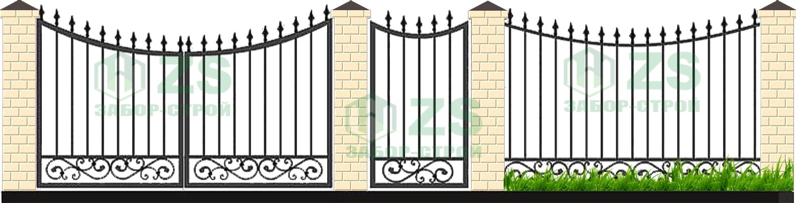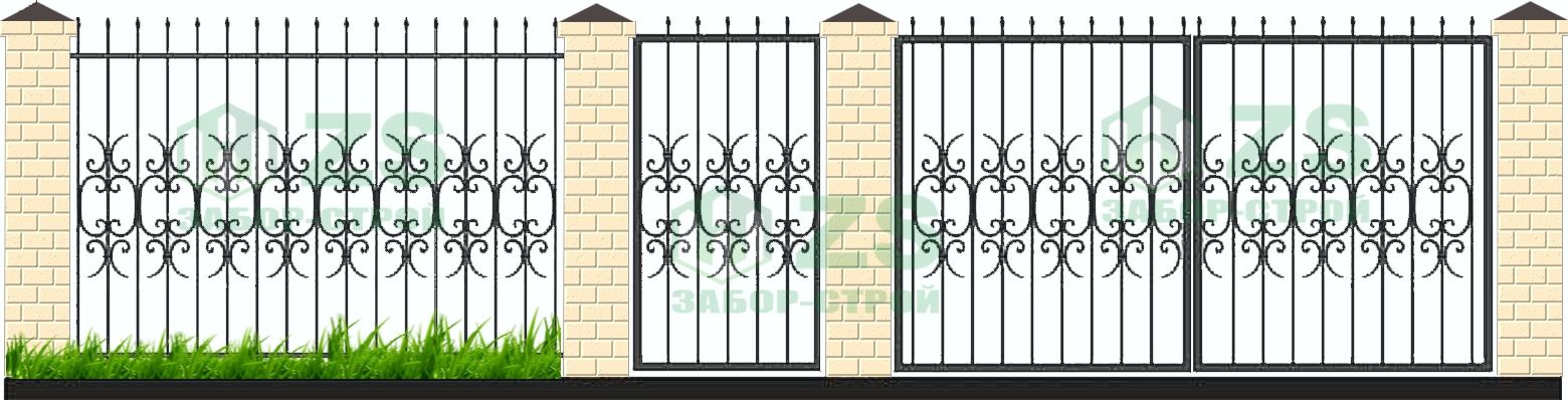 Конструкция кованого забора на ленточном фундаменте с кирпичными столбами: